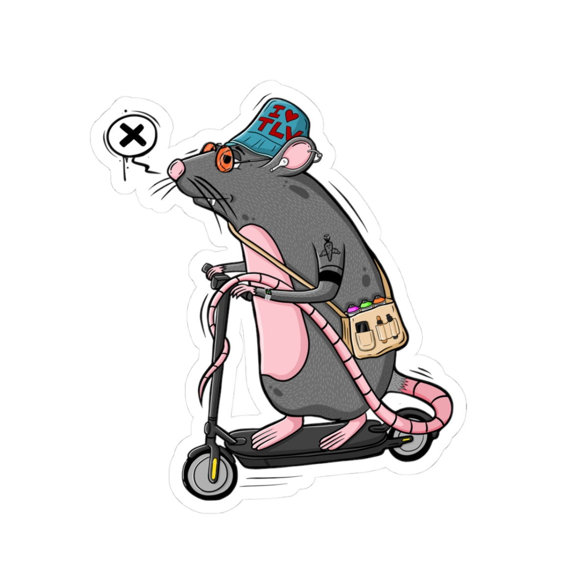Meet the true mascot of the city — a Tel Aviv rat on a scooter, rocking an i ❤️ TLV cap and carrying spray cans for some late-night chaos.